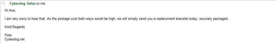 nekje med navdusenostjo, da sem koncno le dobila zapestnico, in razocaranjem nad poskodbo ornamenta, sem ze razmisljala, kako bi zadevo lahko popravila. sms cimru naj posodi sekundno lepilo, in kratko sporocilo folku pri cyberdog, da ce bi se zadeva dala kako zamenjat. da nocem nazaj denarja, gre se mi za zapestnico.