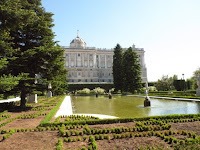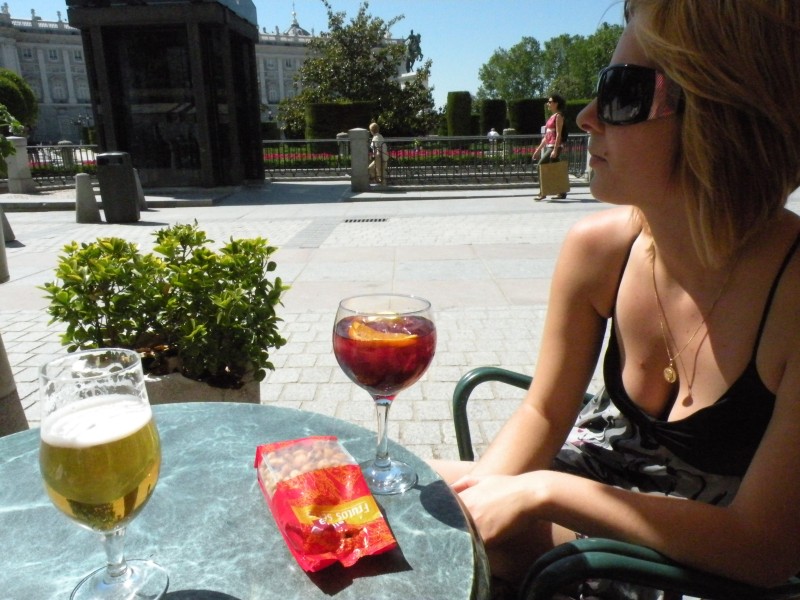 pred obiskom kraljevskega parka sma se ustavile na pivu in eni najboljsih sangrij, kar sma jih spile. sicer je bila tudi ena drazjih (malo vec kot 6€), ampak se je splacalo. restavracije in kafici pred kraljevo palaco so namrec bili filter za vse tiste nemogoce in totalno nadlezne ameriske turiste, ki so s svojimi velikimi fotoaparati, belimi nogavicami in veliko preglasno govorico kazili drugace dokaj simpaticno mesto.